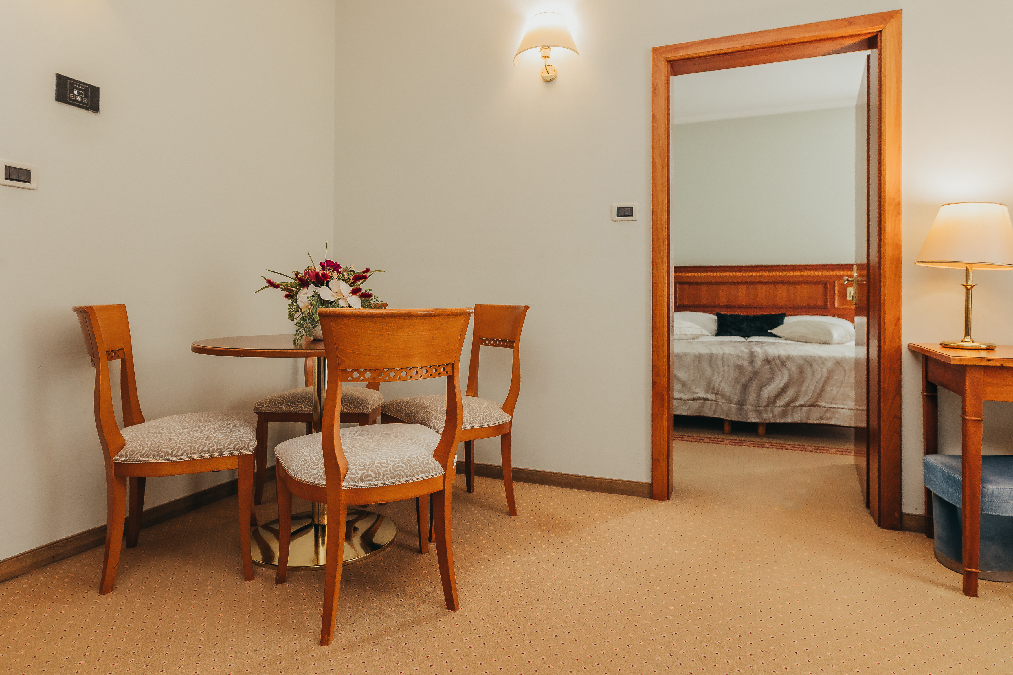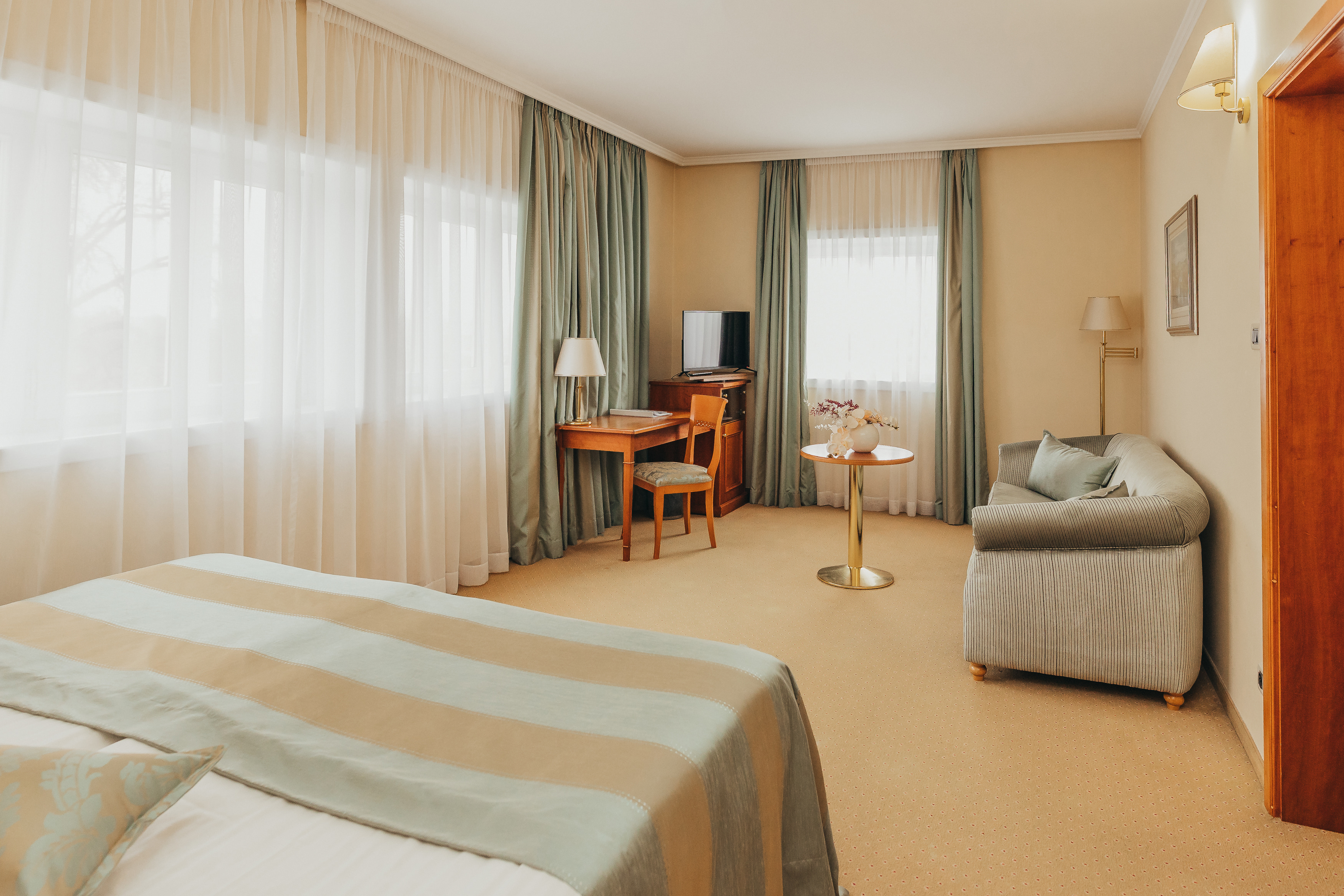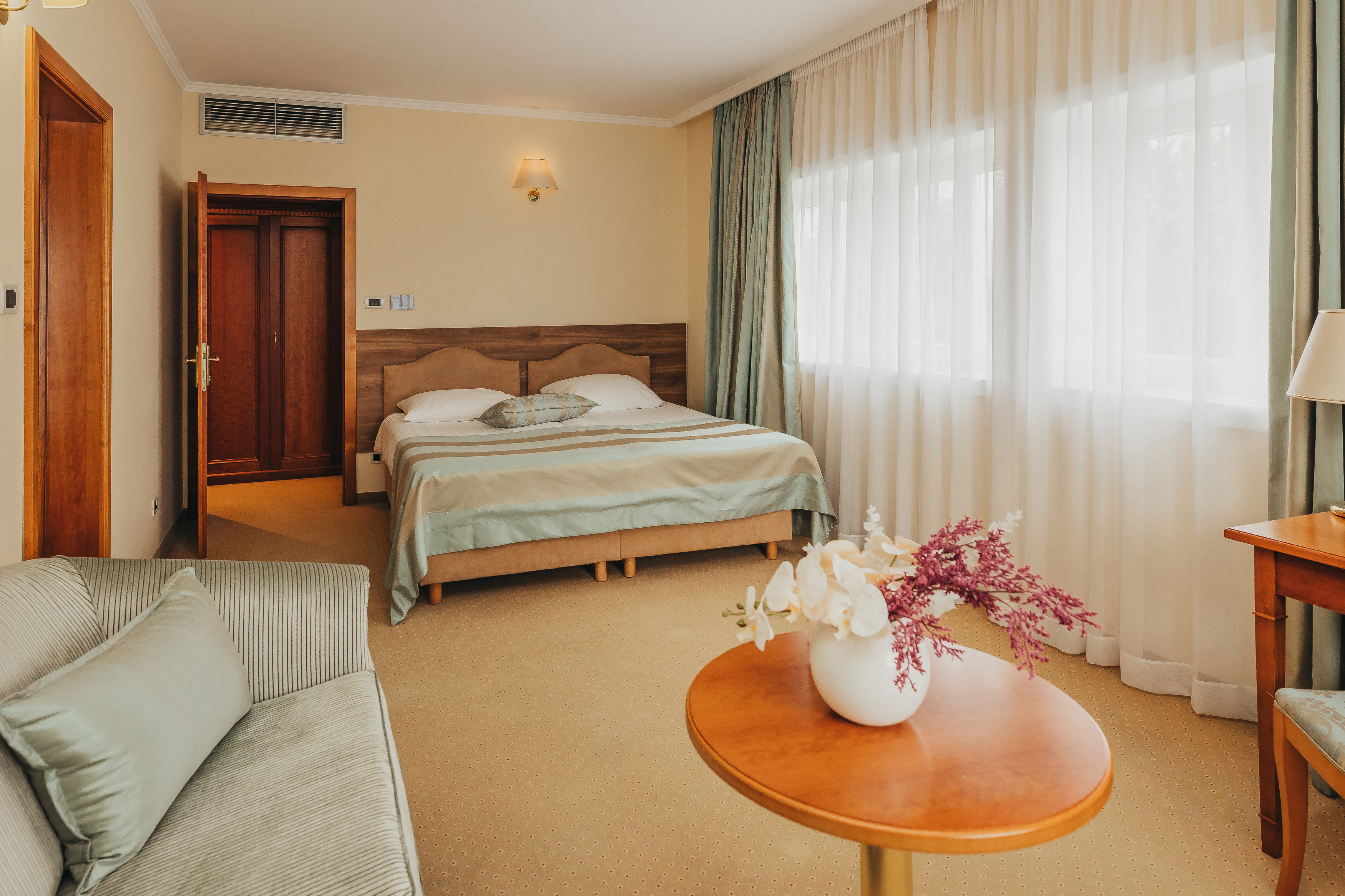 Poslovni / obiteljski apartmani iz naše ponude objedinjuju prednosti dvokrevetnih i deluxe soba; imaju prostrani dnevni i radni boravak, spavaću sobu koja nudi smiraj, kupaonicu koje potiče osvježenje, balkon s divnim pogledom.