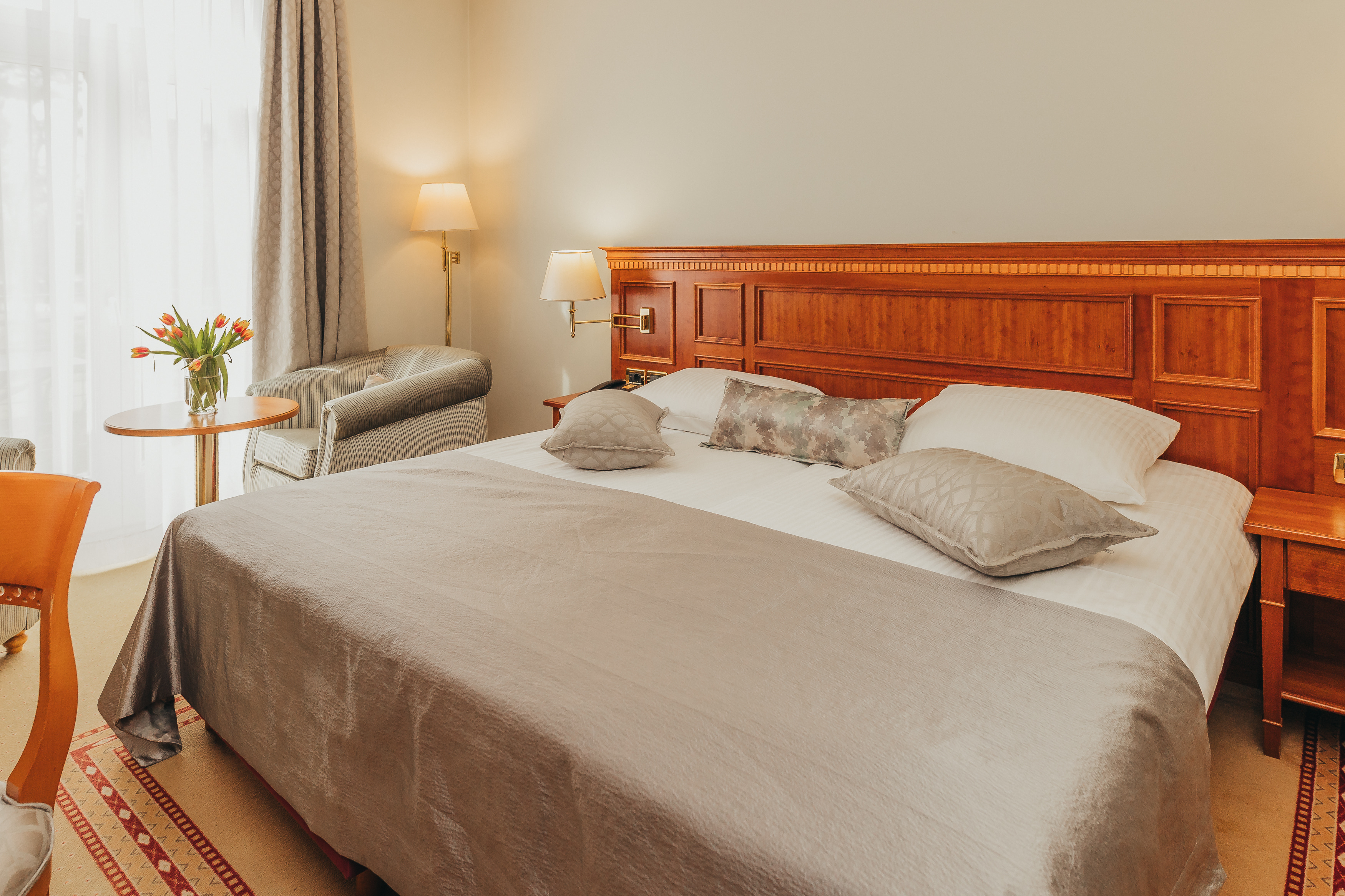 Every room and apartment in the hotel caries a name of a beautiful flower. They offer the scented pleasure of stay surrounded by a hundred year old park and beautiful blue river waters. Rooms are furnished in a sophisticated blend of rustic and modern styles.